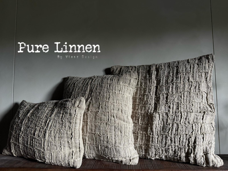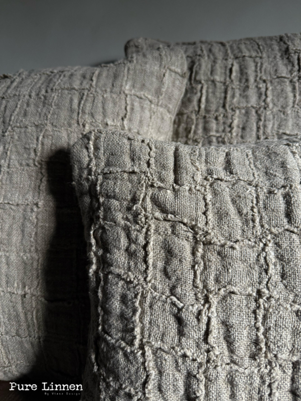 Het linnen sierkussen GENESIS van Pure Linnen wordt gekenmerkt door een uitgesproken blokstructuur met subtiel reliëf. Het ritmische patroon van vlakken en lijnen geeft het ontwerp een krachtig, maar ingetogen karakter.